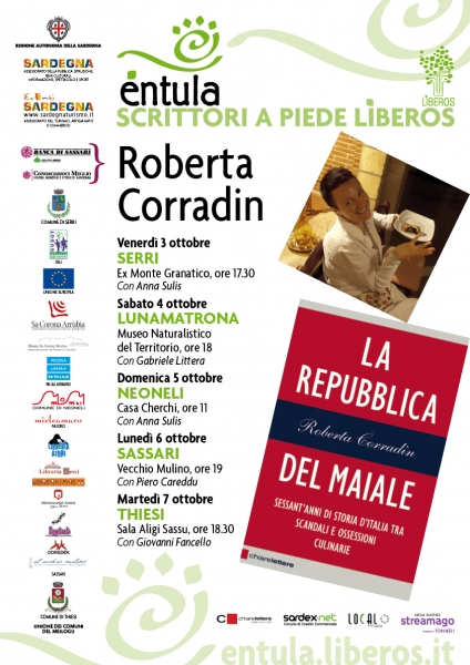 THIESI. Dai tavoli dei ristoranti ai banchi del Parlamento, dalla Costituzione alla fine della Seconda Repubblica tra aneddoti, personaggi, fatti e mode Roberta Corradin ha fotografato l’Italia di ieri e di oggi nel suo “La repubblica del maiale” (Chiarelettere) e da venerdì 3 ottobre fino a martedì 7 sarà in tour con il festival letterario diffuso Éntula per raccontare un sorprendente ritratto dell’italiano medio. L'appuntamento a Thiesi (presso la Sala Sassu insieme al giornalista Giovanni Fancello) è previsto per martedì 7 alle 18.30.