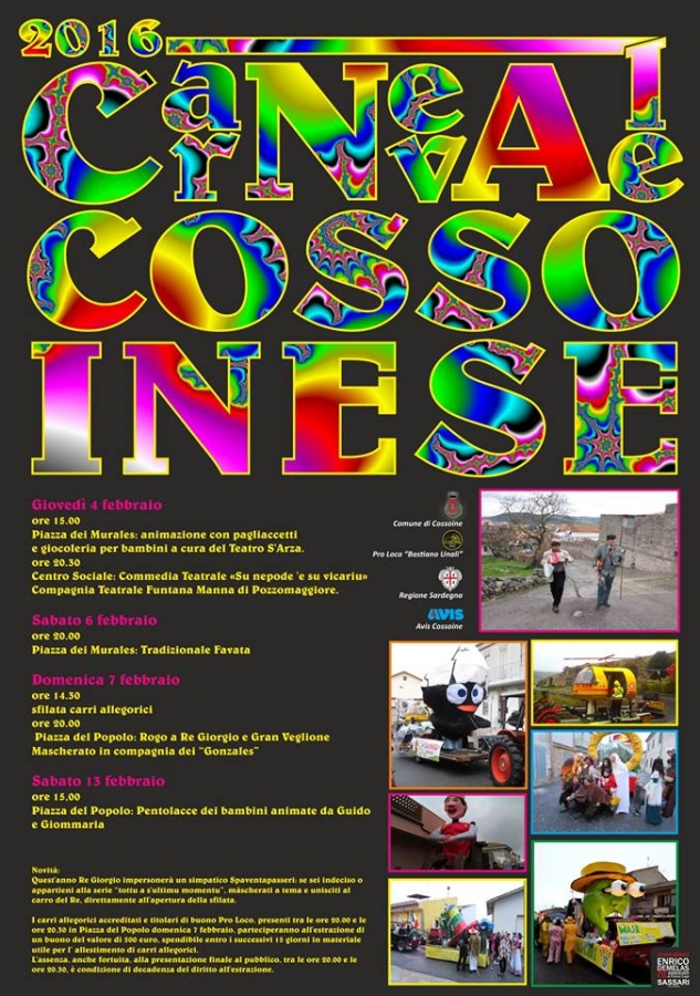 COSSOINE. L'amministrazione comunale, l'Avis e la pro loco "Bastiano Unali", con il contributo della Regione Sardegna, hanno predisposto il programma per il "Carnevale Cossoinese 2016". Si inizia giovedì 4 febbraio alle 15.00 in piazza dei murales con uno spettacolo di animazione con pagliaccetti e giocoleria per bambini a cura del teatro "S'arza". Alle ore 20.30, nei locali del centro sociale, la compagnia teatrale "Funtana Manna" di Pozzomaggiore metterà in scena una commedia dal titolo "Su nepode 'e su vicariu". Sabato 6 alle 20.00, sempre in piazza dei murales, la tradizionale favata. Domenica 7 febbraio alle ore 14:30 sarà la volta sfilata dei carri allegorici. La serata si concluderà alle 20.00, in piazza del popolo, con il rogo di re Giorgio e un gran veglione mascherato in compagnia dei "Gonzales". Il carnevale cossoinese si concluderà sabato 13 febbraio alle ore 15 in piazza del popolo con le pentolacce dei bambini animate da Guido e Giommaria.