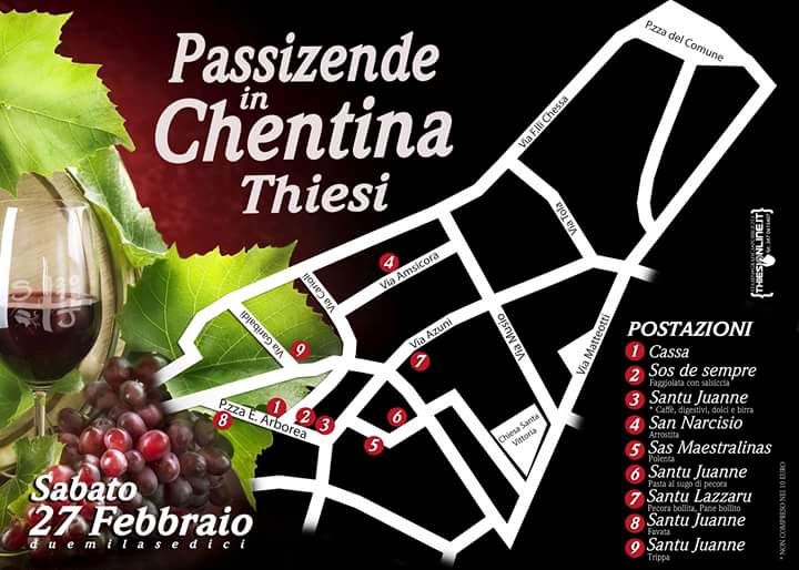 THIESI. Sabato 27 febbraio, a partire dalle 18 presso il centro storico (sas rochitas), si svolgerà la manifestazione "Passizende in Chentina" organizzata dal comitato San Giovanni Battista 2016. L'evento, oltre a proporre un momento tipicamente culinario con l'assaggio del vino e dei piatti della tradizione thiesina, avrà l'intento di creare un momento di aggregazione. Oltre alle cantine, sarà possibile visitare le vie del paese che, per l'occasione, saranno animate dal fuoco degli artigiani locali, dalla musica e da varie attrazioni. Il costo del bicchiere è di 10 euro.