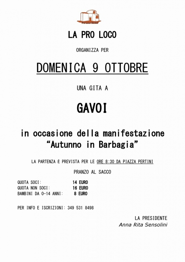 Siligo. La Pro loco presieduta da Anna Rita Sensolini organizza per domenica 9 ottobre una gita per Gavoi per "Autunno in Barbagia". La partenza è prevista per le 8.30 da piazza Pertini. La quota di adesione è di 14 (soci), 16 (non soci) e 8 euro (bambini tra i 0 e i 14 anni). Il pranzo è al sacco. Per le iscrizioni si può contattare il numero 3495318498.