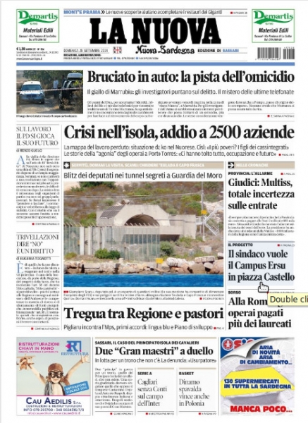 La Nuova aberit cun unos cantos datos in pitzu de s'ocupatzione: «Crisi in s'ìsula, adiosu a 2500 aziendas». In rassigna sa situtatzione in su chirru nugoresu e in Portu Turre in ue sos operajos narant: «Nos ant bogadu totu, ocupatzione e tempus benidore». In s'ìnteri si registrat una trègua intre Regione e pastores: «Pigliaru addòbiat s'Mps, primos acòrdios: limba biaita e Pranu de isvilupu».