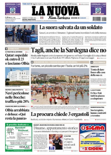 Su verbu "segare" aberit oe sas primas pà ginas de sos giornales sardos. «Mènguas, finas sa Sardigna narat chi nono» est su tìtulu mannu de La Nuova, chi sighit gasi: «Pesada de sas Regiones contra a sa manovra de su guvernu: in s'ìsula su Cussìgiu dat su stop a Renzi. Sos arriscos: prus tassas e unu sacrifìtziu de à teros 97 milliones. Pigliaru: "Isvantà gios medas"».