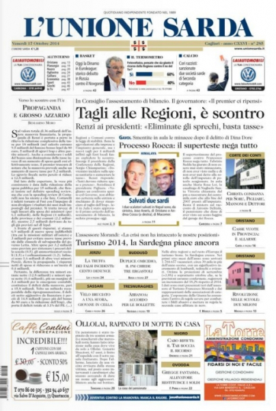 Simigiante meda s'abertura de L'Unione sarda: «Mènguas a sas Regiones, est cuntierra». Sighende a lèghere agatamus sas parà ulas de su presidente de sa Cunferèntzia de sas Regiones Segio Chiamparino: «Amus a dèvere intervènnere in s'ispesa sanità ria o ismanniare sas tassas». Renzi li rispondet: «Totus devent minimare gastos e pretesas». Pigliaru narat chi «cherimus unu cunfrontu abertu cun su Guvernu, no amus tzertesa in pitzu de sas intradas e arriscamus de dèvere renuntziare a sa mèngua de s'Irap».