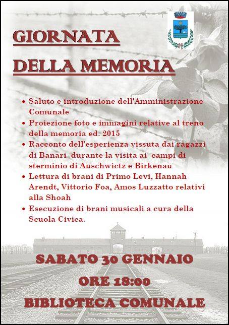 BANARI. Sabato 30 gennaio alle 18.00, nei locali della biblioteca Barore Sassu, l’amministrazione comunale organizza una serata per rendere omaggio alle vittime dell’olocausto. Dopo i saluti e l’introduzione da parte dell’amministrazione comunale, saranno proiettate foto e immagini relative al progetto “Treno della memoria 2015”. I ragazzi di Banari racconteranno il loro viaggio nei campi di sterminio di Auschwictz e Birkenau. A seguire saranno letti alcuni brani inerenti la Shoah e tratti dalle opere di Hannah Arendt, Primo Levi, Vittorio Foa e Amos Luzzatto. Non mancheranno intermezzi musicali eseguiti dalla scuola civica di musica.