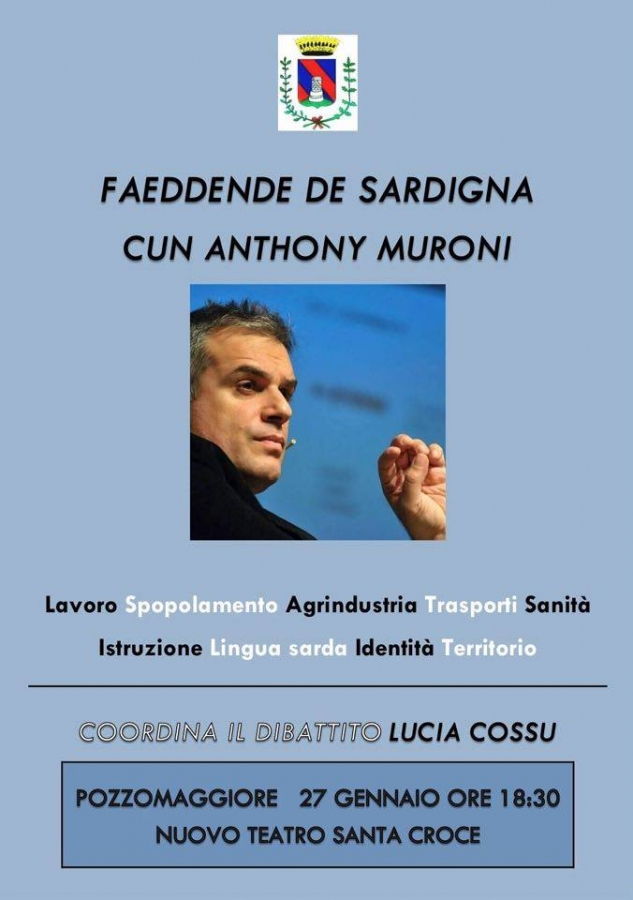 Pozzomaggiore. Venerdì 27 gennaio alle 18.30, nel nuovo teatro Santa Croce, l’amministrazione comunale organizza il dibattito "Faeddende de Sardigna cun Anthony Muroni". Tanti i temi che il giornalista e scrittore, nonché ex direttore dell’Unione Sarda, affronterà con la popolazione: lavoro, spopolamento, agroindustria, lingua sarda, identità, scuola, trasporti, sanità. Attualmente Muroni gestisce un blog, da lui stesso definito nel manifesto programmatico “Uno spazio aperto sulla Sardegna, sull’Europa, sul mondo”, che in tre mesi di vita ha già raccolto 14mila iscritti su facebook e 400mila pagine viste. Alla serata, coordinata da Lucia Cossu, sono invitati a partecipare tutti gli amministratori, le associazioni, i comparti produttivi e commerciali del territorio.