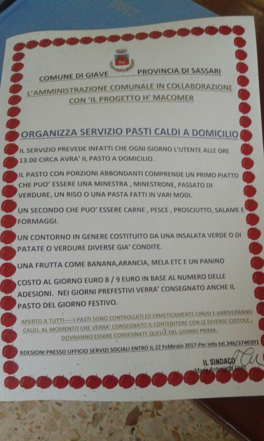 Giave. Il Comune, con la collaborazione del “progetto H” di Macomer, ha promosso un servizio di pasti caldi a domicilio. Come specificato nella nota «si tratta di una grande opportunità che viene data sia a persone svantaggiate che ad anziani soli oppure a chi per motivi di lavoro non riesce a organizzarsi con i pasti». Il menù, che verrà portato direttamente a casa attorno alle 13.00, prevede un primo abbondante (a scelta tra minestra, minestrone, passato di verdure, riso e pasta cucinata in vari modi), un secondo (carne, pesce, prosciutto, salame e formaggi), un contorno (insalata verde, di patate e o di verdure già condite), una frutta e un panino. Le cibarie, preventivamente controllate, arriveranno chiuse in contenitori ermetici. In caso di assenza, l'utente dovrà darne comunicazione qualche giorno prima. Al momento della consegna, dovranno essere restituite le ciotole del giorno precedente. Il costo giornaliero varierà tra gli 8 e i 9 euro in base al numero delle adesioni. Per usufruire del servizio è necessario darne comunicazione all'ufficio dei Servizi sociali entro lunedì 20 febbraio. Maggiori informazioni al numero di telefono 3463749391.
