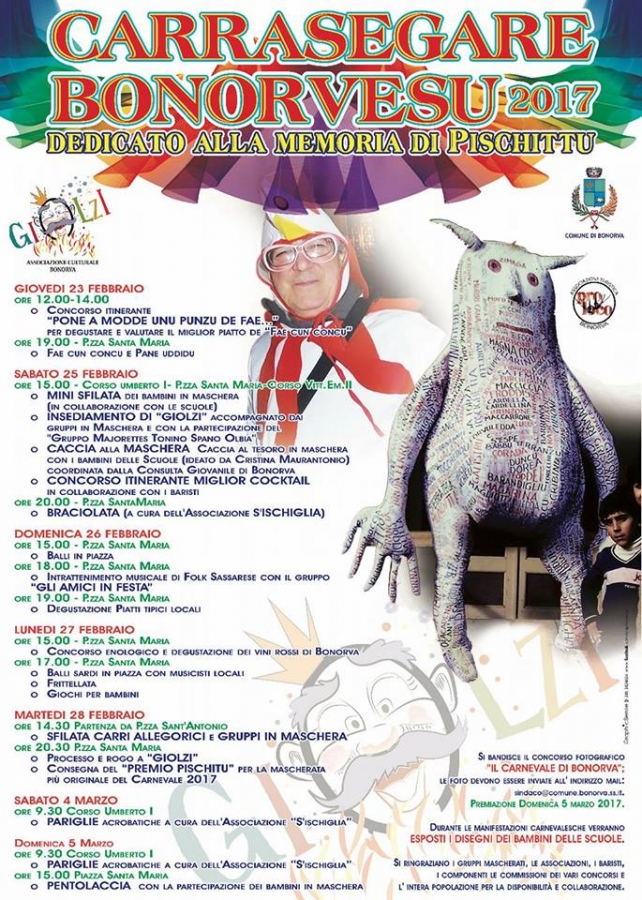 Bonorva. Si preannuncia ricca di eventi l’edizione 2017 del “Carrasegare Bonorvesu”, dedicato alla memoria di Battista Angius (Pischittu), organizzato dall’amministrazione comunale, dalla Pro loco e dall’associazione culturale “Giolzi”. Giovedì 23 febbraio dalle 12.00 alle 14.00, si svolgerà il concorso itinerante “Pone a modde unu punzu de fae…”, riservato al miglior piatto di “Fae cun Concu”. La stessa specialità, assieme a su “Pane Uddidu”, potrà essere degustata alle 19.00 (Piazza Santa Maria). Sabato 25 dalle 15.00 (Corso Umberto I, Piazza Santa Maria e Corso Vittorio Emanuele II) spazio alla mini sfilata dei bambini in maschera organizzata in collaborazione con le scuole e all’insediamento di “Giolzi”, accompagnato dai gruppi in maschera e con la partecipazione del “Gruppo “Majorettes Tonino Spanu” di Olbia. Previsti la caccia alla maschera con i ragazzi delle scuole (ideato da Cristina Maurantonio), coordinata dalla Consulta Giovanile, e un concorso itinerante riservato al miglior cocktail in collaborazione con i baristi. La giornata si concluderà alle 20.00 (piazza Santa Maria) con una braciolata promossa dall’associazione “S’Ischiglia”. La stessa piazza sarà protagonista domenica 26 con i balli (15.00), con il gruppo “Gli amici in festa”, che eseguirà musica folk sassarese (18.00) e con una degustazione di piatti tipici locali (19.00). Lunedì 27 (piazza Santa Maria), alle 15.00, è in programma un concorso enologico e una degustazione dei vini rossi locali. La serata proseguirà alle 17.00 con i balli sardi eseguiti da musicisti bonorvese accompagnati dalle frittelle e da giochi per bambini. Martedì 28 alle 14.30 (piazza Sant’Antonio) il via da della sfilata dei carri allegorici e dei gruppi in maschera che culminerà, alle 20.30 (piazza Santa Maria) con il processo a Giolzi e la consegna del premio “Pischitu” riservato alla miglior mascherata del carnevale 2017. Sabato 4 alle 9.30, in corso Umberto I, sarà volta dell’appuntamento con le pariglie acrobatiche (che saranno replicate domenica 5 alla stessa ora) a cura dell’associazione S’Ischiglia”. Gran finale domenica 5 alle 19.00 (piazza Santa Maria) con la pentolaccia che vedrà la partecipazione dei bambini in maschera. Per l’occasione è stato anche bandito il concorso fotografico “Il Carnevale di Bonorva”. Chi volesse partecipare può mandare i suoi scatti all’indirizzo di posta elettronica sindaco@comune.bonorva.ss.it. La premiazione avverrà domenica 5 marzo così come sarà possibile visionare, durante tutto l’arco delle manifestazioni, i disegni realizzati dai bambini delle scuole.