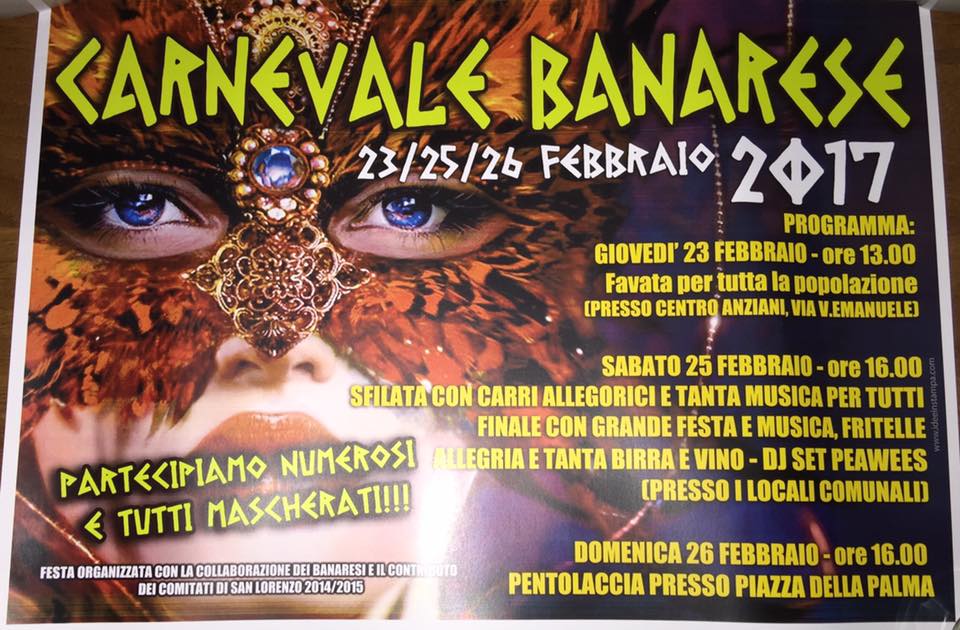 Banari. Saranno tre giornate molto intense quelle del carnevale banarese 2017. Il programma, predisposto da un comitato spontaneo in collaborazione con la cittadinanza e il contributo dei comitati 2014 e 2015 di San Lorenzo Martire, avrà inizio giovedì 23 febbraio alle 13.00, presso il centro anziani di via Vittorio Emanuele, con la favata offerta a tutta la popolazione. Le manifestazioni proseguiranno sabato 25 alle 16.00 con la sfilata dei carri allegorici. La serata si concluderà nei locali comunali con una grande festa a suon di musica (dj Set Peawees), frittelle e vivande varie. Domenica 5 marzo alle 16.00 gran finale con la pentolaccia che avrà luogo in piazza della Palma.