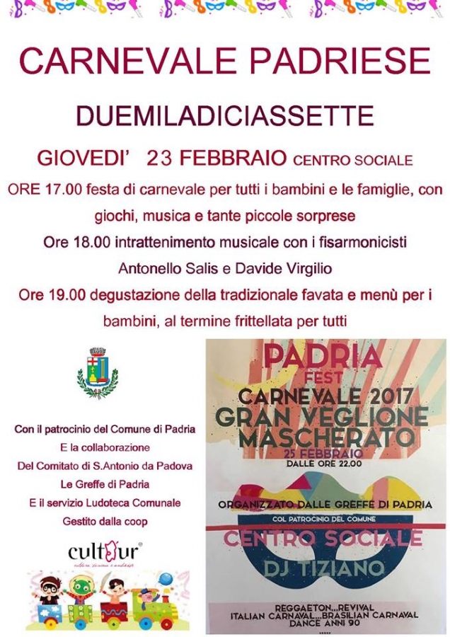 Padria. Inizierà giovedì 23 febbraio l’edizione 2017 del carnevale padriese. Gli eventi, patrocinati dal comune con la collaborazione del comitato di Sant’Antonio da Padova, “Le Greffe di Padria” e il servizio di ludoteca comunale gestito dalla cooperativa “Cultour”, avranno inizio alle 17.00, nel centro sociale, con la festa di carnevale rivolta a tutti i bambini e alle famiglie. Previsti giochi, musica e tante sorprese. Alle 18.00 spazio alla musica con i fisarmonicisti Antonello Salis (Padria) e Davide Virgilio (Cossoine). Alle 19.00 gran finale con la favata, frittelle per tutti e menù per bambini. Sabato 25 dalle 22.00, sempre presso i locali del centro sociale, si terrà il gran veglione mascherato, organizzato dalle griffe di Padria, con la musica di dj Tiziano.