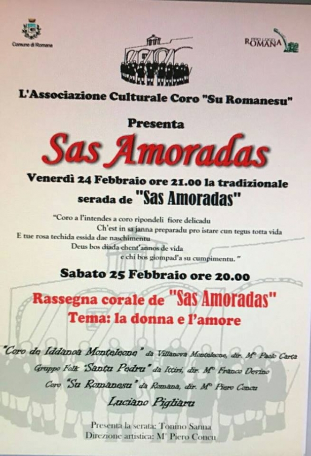 Romana. “Coros a l’intendes a coro ripondeli fiore delicadu/ ch’est in sa janna preparadu pro istare cun tegus tutta vida/e tue rosa techida essida dae naschimentu/deus bos diada chent’annos de vida/e chi bos giompad’a su cumpimentu". Sono alcuni versi del canto che, nella giornata di venerdì 24 febbraio, con inizio alle 21.00, verranno cantati per la tradizionale serata de “Sas Amoradas”. Un’antica usanza che si perde nella notte dei tempi e che, originariamente, si teneva il lunedì antecedente il martedì grasso. Una serenata alle ragazze nubili da parte dei pretendenti, con il chiaro intento di conquistarle e di portarle ai balli di carnevale. Ripresa negli anni settanta, viene mantenuta in auge per circa trent’anni per poi essere di nuovo abbandonata agli inizi del 2000. Dal 2015, dopo sei anni di organizzazione da parte della Pro loco, la manifestazione viene curata dall’associazione culturale coro “Su Romanesu”. La due giorni sarà completata sabato 25 alle 20.00 con la seconda rassegna corale a tema (la donna e l’amore) a cui prenderanno parte il “Coro de Iddanoa Monteleone” (maestro Paolo Carta), il gruppo folk “Santu Pedru” di Ittiri (maestro Franco Devino), il cantante Luciano Pigliaru e i padroni di casa diretti dal maestro Piero Concu, che curerà anche la direzione artistica della serata. Presenterà la serata Tonino Sanna.