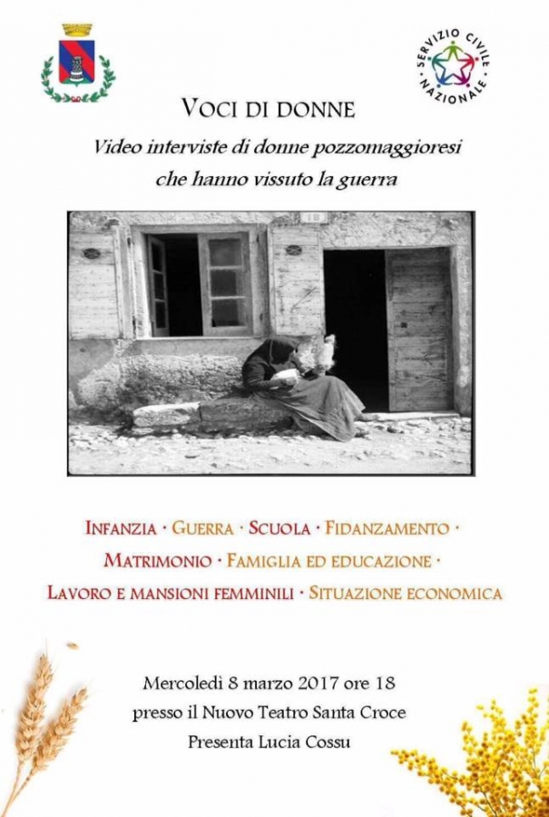 Pozzomaggiore. In occasione della festa della donna, i volontari del Servizio civile e l’amministrazione comunale hanno organizzato “Voci di Donne”, una serie di video interviste alle signore locali che hanno vissuto il periodo della guerra. La serata, che sarà presentata da Lucia Cossu, avrà luogo mercoledì 8 marzo alle 18.00, nel nuovo Teatro Santa Croce. Tanti i temi trattati: infanzia, guerra, scuola, fidanzamento, matrimonio, educazione, situazione economica, lavoro e mansioni femminili. Protagonisti dell’evento saranno anche i ragazzi della locale scuola media che, con una musica di sottofondo e con l’ausilio di immagini, daranno lettura di alcune poesie sulle donne.