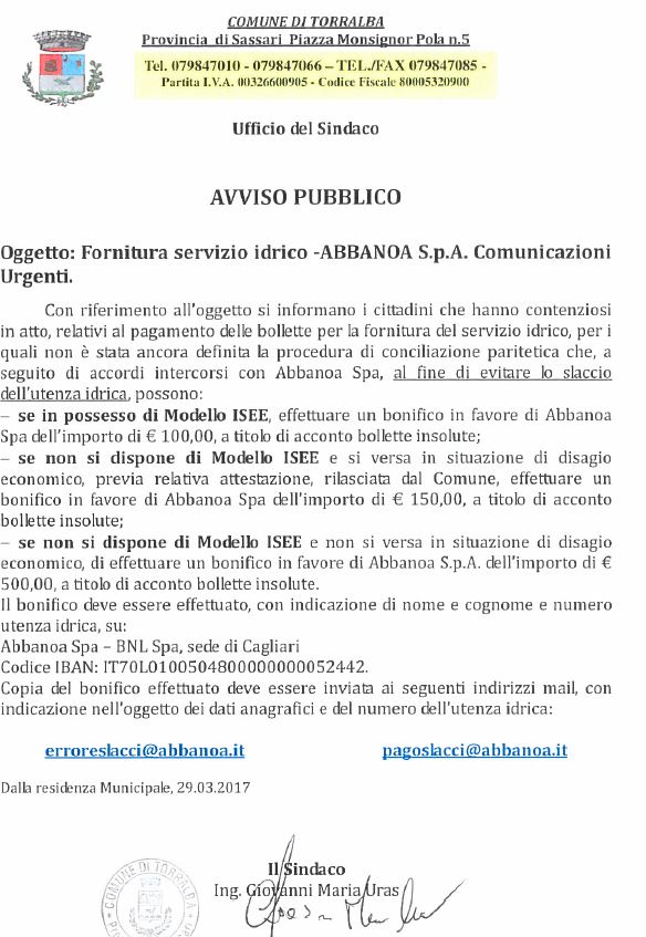 Torralba. Dopo gli accordi con il gestore de servizio idrico integrato “Abbanoa”, sono state pubblicate le modalità per evitare lo slaccio dell’utenza idrica rivolte ai cittadini che hanno contenziosi in essere, relativi alla fornitura idrica, per i quali non è stata ancora definita la procedura di conciliazione paritetica. Coloro che sono in possesso di un modello ISEE, possono effettuare un bonifico in favore di Abbanoa Spa dell’importo di 100 euro a titolo di acconto bollette insolute. Due le soluzioni per chi non dispone di modello ISEE. Per chi versa in condizioni di disagio economico (attestazione rilasciata dal Comune) potrà effettuare un bonifico a favore di Abbanoa Spa dell’importo di 150 euro. La seconda è invece rivolta a chi non versa in situazione di disagio. In questo caso l’acconto da versare al gestore è di 500 euro. Entrambe a titolo di acconto bollette insolute. Il bonifico deve essere effettuato, indicando nome e cognome e la relativa utenza idrica su: ABBANOA Spa- BNL Spa, sede di Cagliari, codice IBAN IT70L0100504800000000052442. La copia del bonifico deve essere inviata, con l’indicazione in oggetto dei dati anagrafici e del numero di utenza idrica, agli indirizzi e-mail erroreslacci@abbanoa.it e pagoslacci@abbanoa.it. Inoltre come ci ha dichiarato Giovanni Uras «Abbanoa ha provedduto al riallaccio di tre utenze: una due settimane fa e due nella giornata di ieri (30 marzo). Sono felice che il gestore, che ringrazio per la celerità, abbia accolto le istanze dei cittadini».
