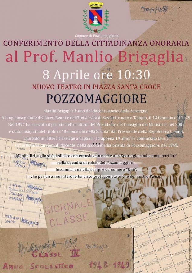 Pozzomaggiore. Sabato 8 aprile, con inizio alle 10.30, presso il Nuovo Teatro Santa Croce, avrà luogo la cerimonia di conferimento  della cittadinanza onoraria, voluta fortemente dall’amministrazione comunale guidata da Mariano Soro, al professor Manlio Brigaglia. Nato a Tempio Pausania il 12 gennaio del 1929, è stato per tanto tempo professore del liceo Domenico Alberto Azuni e dell’ Università di Sassari. Nel 1997 è stato insignito del premio della cultura da parte del presidente del Consiglio mentre nel 2003 ha ricevuto il titolo di “Benemerito della Scuola” da parte dell’allora presidente della Repubblica Carlo Azeglio Ciampi. Nel 1949 ha iniziato la sua carriera di docente proprio anella scuola media privata di Pozzomaggiore, dove ha avuto modo di giocare, nel ruolo di portiere, nella locale squadra di calcio.
