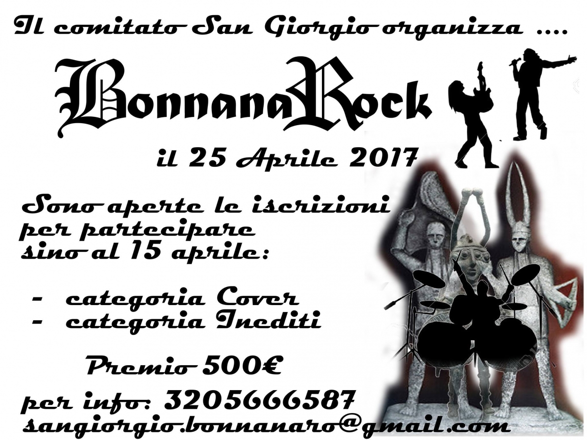 Bonnanaro. Il comitato dei festeggiamenti in onore di San Giorgio Martire 2017 ha aperto le iscrizioni per il “BonnaRock”. La serata musicale, che si svolgerà martedì 25 aprile, prevede due categorie: coverband e inediti. Gli interessati possono dare la propria adesione entro sabato 15 aprile al numero di telefono 3205666587, all’indirizzo di posta elettronica sangiorgio.bonnanaro@gmail.com o nella pagina Facebook San Giorgio ‘17. Il premio per il miglior gruppo è stato quantificato in 500 euro.