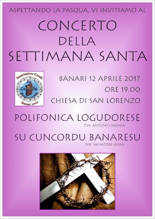 Banari. L’associazione corale “Su Cuncordu Banaresu” ha organizzato per mercoledì 12 aprile alle 19.00, nella Chiesa parrocchiale di San Lorenzo Martire, il “Concerto della Settimana Santa”. I protagonisti della manifestazione saranno, oltre ai padroni di casa diretti dal maestro Salvatore Serra, anche la “Polifonica Logudorese” di Bonorva (maestro Antonio Manca).
