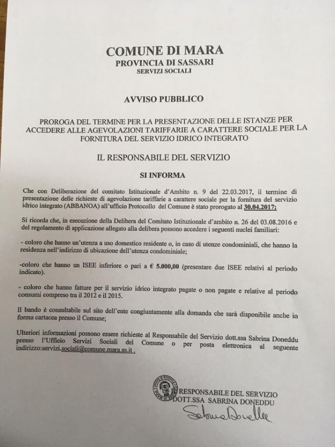 Mara. È stata prorogata al 30 aprile la scadenza delle istanze relative al Bonus Idrico. Per usufruire delle agevolazioni è necessario essere residenti in paese nell’abitazione oggetto della fornitura idrica (domestica o condominiale), avere un reddito ISEE inferiore o pari a 5mila euro (presentarne due relative al periodo indicato) e possedere le fatture di Abbanoa (pagate e non) relative al periodo 2012-2015. La domanda e il bando possono essere scaricati dal sito istituzionale www.comune.mara.ss.it. Per maggiori informazioni ci si può rivolgere alla responsabile del servizio dottoressa Sabrina Doneddu (ufficio dei Servizi sociali) o inviare un messaggio all’indirizzo di posta elettronica servizi.sociali@ comune.mara.ss.it.