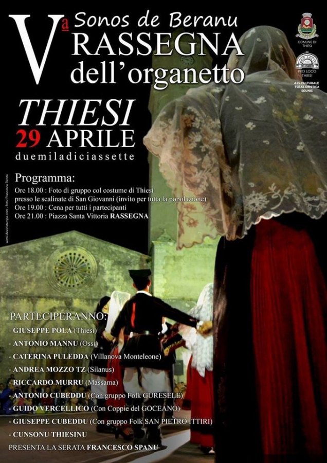 Thiesi. Sarà un sabato 29 aprile all’insegna dei suoni e dei balli della nostra isola. Grazie all’impegno e alla costanza di Giuseppe Pola, con il patrocinio del Comune e la collaborazione della Pro loco e dell’associazione culturale folkloristica Seunis, è stata organizzata la quinta rassegna dell’organetto “Sonos de Beranu”. L’evento avrà inizio alle 18.00 con la foto di gruppo (inviato rivolto a tutta la popolazione) con il costume di Thiesi nelle scalinate di San Giovanni mentre alle 19.00 verrà offerta la cena a tutti i partecipanti. Dalle 21.00, in piazza Santa Vittoria, sarà possibile assistere all’esibizione di Giuseppe Pola (Thiesi), Antonio Mannu (Ossi), Caterina Puledda (Villanova Monteleone), Andrea Motzo (Silanus), Riccardo Murru (Massama), Antonio Cubeddu (con il gruppo folk di Sassari Gurusele), Guido Verzellino (che accompagnerà alcune coppie provenienti dal Goceano) e Giuseppe Cubeddu di Ossi (con il gruppo folk San Pietro di Ittiri). La serata sarà allietata dai canti del “Cunsonu Thiesinu”. La manifestazione sarà presentata da Francesco Spanu di Torpè.