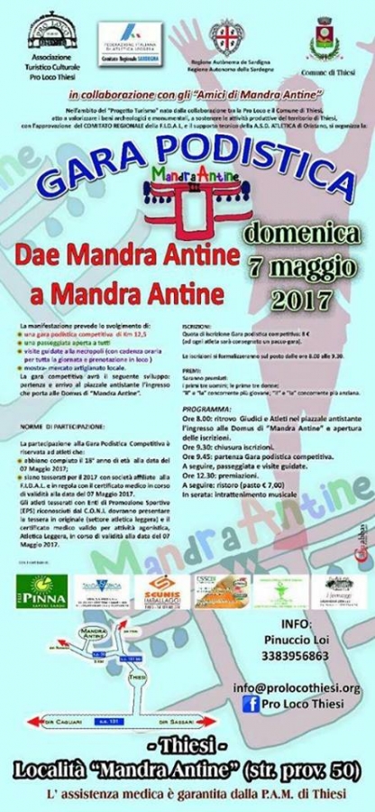 Thiesi. L’associazione turistica Pro loco, il Comitato Regionale Sardegna (federazione italiana di atletica leggera), il Comune e la Regione, in collaborazione con gli “Amici di Mandra Antine” organizzano per domenica 7 maggio la gara podistica “Dae Mandra Antine a Mandra Antine”. Nato nell’ambito del “Progetto Turismo”, frutto di un lavoro di collaborazione tra la Pro loco e il Comune, l’evento intende valorizzare i beni archeologici e monumentali del paese, oltre che sostenere le attività produttive. La manifestazione si caratterizzerà in una gara podistica competitiva (costo dell’iscrizione 8 euro) della lunghezza di 12,5 chilometri (partenza e arrivo nel piazzale antistante l’ingresso che porta alle domus), in una passeggiata aperta a tutti, in visite guidate alla necropoli (con cadenza oraria per tutta la giornata e prenotazione in loco). A ogni atleta verrà consegnato un pacco gara. La partenza è prevista per le 9.45. Inoltre, verrà allestita una mostra-mercato dell’artigianato locale. Possono partecipare coloro che hanno compiuto i 18 anni. che siano in possesso della tessera 2017 per le società affiliate alla F.I.D.A.L e in regola con il certificato medico in corso di validità. Gli atleti che, invece sono tesserati con l’Eps (enti di promozione sportiva), riconosciuti dal Coni, dovranno presentare la tessera in originale (settore atletica leggera) con il certificato medico per attività agonistica (atletica leggera). Il tutto deve essere valido alla data del 7 maggio. Il programma prevede alle 8.00 il ritrovo dei giudici e degli atleti nel piazzale antistante le domus di Mandra Antine. Gli interessati potranno dare le adesioni entro le 9.30. Alle 12.30 sono in programma le premiazioni (primi tre uomini e prime tre donne, il o la concorrente più giovane o più anziano) e il ristoro (costo 7 euro). In serata è in programma un intrattenimento musicale.