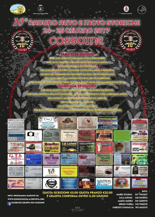 Cossoine. Importante ricorrenza per il gruppo 500. Sabato 24 e domenica 25 giugno verrà festeggiata la decima edizione del raduno delle auto e moto storiche. Organizzato in collaborazione con gli amministratori comunali guidate da Mariano Soro (Pozzomaggiore) e Sabrina Sassu (Cossoine) e le relative Pro loco.