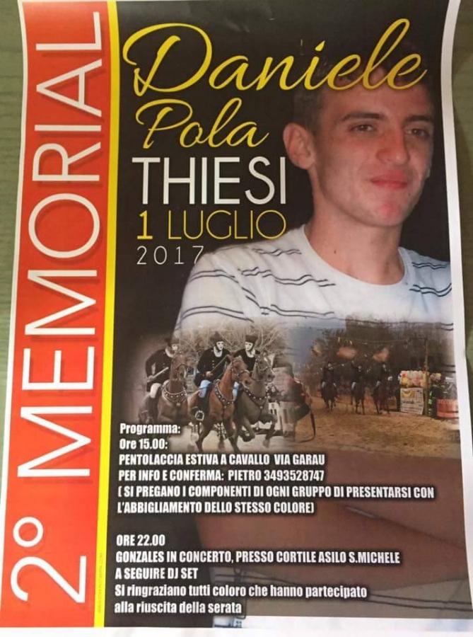 Thiesi. Un gruppo di amici ha organizzato per sabato 1 luglio il secondo memorial in ricordo di Daniele Pola. La manifestazione avrà inizio alle 15.00 con la pentolaccia estiva che avrà luogo in via Garau. Gli organizzatori consigliano un abbigliamento monocolore per i componenti di ogni gruppo.