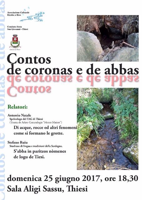 Le relazioni saranno curate da Antonio Natale, speleologo del Tag locale (di acque, rocce ed altri fenomeni, come si formano le grotte) e da Stefano Ruiu, studioso di lingua e tradizioni della Sardegna (s'abba in paritzos nòmenes de logu de Tiesi).