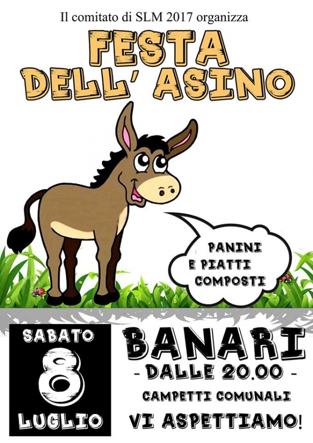 Banari. Il Comitato dei festeggiamenti in onore di San Lorenzo Martire 2017 ha organizzato per sabato 8 luglio a partire dalle 20.00, presso i campetti comunali, la festa dell’asino con degustazione di piatti composti e panini con carne di asinello.