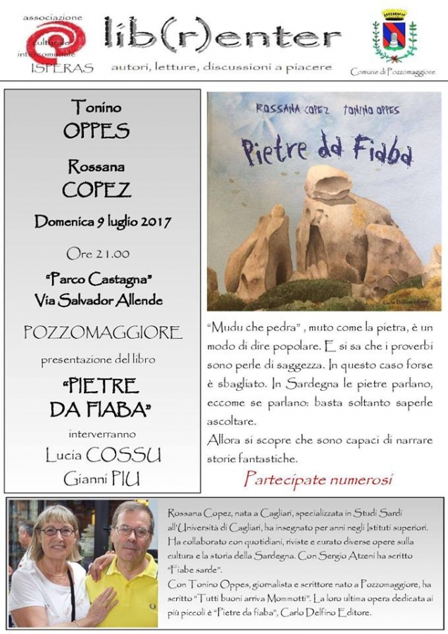 Pozzomaggiore. Non si fermano neanche in estate le attività dell’Associazione culturale intercomunale Isperas, presieduta da Angelo Deriu. Nell’ambito, infatti, del ciclo di incontri letterari “Lib(r)enter”, è stata organizzata per domenica 9 luglio alle 21.00, tra gli ulivi del Parco Castagna di via Salvador Allende, la presentazione del libro “Pietre da Fiaba”, scritto da Tonino Oppes e Rossana Copez e pubblicato dalla Carlo Delfino Editore.