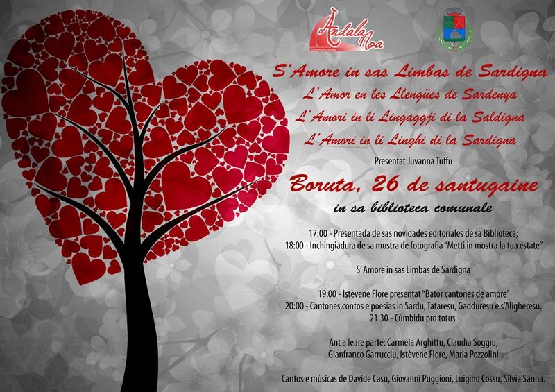 BORUTTA. L'associazione culturale “Àndala noa”, con il patrocinio dell’Amministrazione Comunale e con i fondi regionali per il funzionamento delle biblioteche pubbliche, organizza per sabato 26 dalle 17 presso la Biblioteca comunale, “S’Amore in totus sas Limbas de Sardigna”. Alle 17 saranno presentate le novità editoriali presenti in biblioteca e il concorso di lettura “Il piacere di leggere ti premia”. Alle 18 sarà inaugurata la mostra fotografica “Metti in mostra la tua estate”. Alle 19 Giovanna Tuffu e Stefano Flore presenteranno rispettivamente “S’Amore in totus sas limbas de Sardigna: Cantos, contos e poesias de Amore” e “Bator cantones de Amore”. Dalle 20 partiranno invece le letture (“Contos e poesias”) di Carmela Arghittu (Sardo), Gianfranco Garrucciu (Gallurese), Maria Pozzolini (Sassarese), Claudia Soggiu (Algherese) con i canti e le musiche di Giovanni Puggioni, Luigino Cossu, Davide Casu, Silvia Sanna. A tutti i partecipanti verrà offerto un piccolo rinfresco.