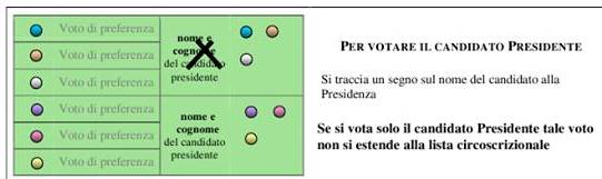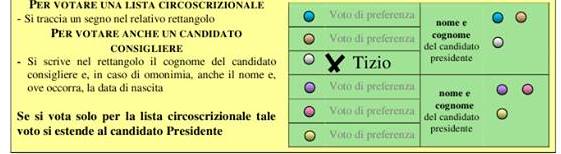 1. Si può votare un candidato consigliere scrivendo nome e cognome a fianco del simbolo del suo partito (basta anche il cognome se non ci sono omonimi candidati). In questo caso il voto va al candidato consigliere, alla sua lista e al presidente collegato.