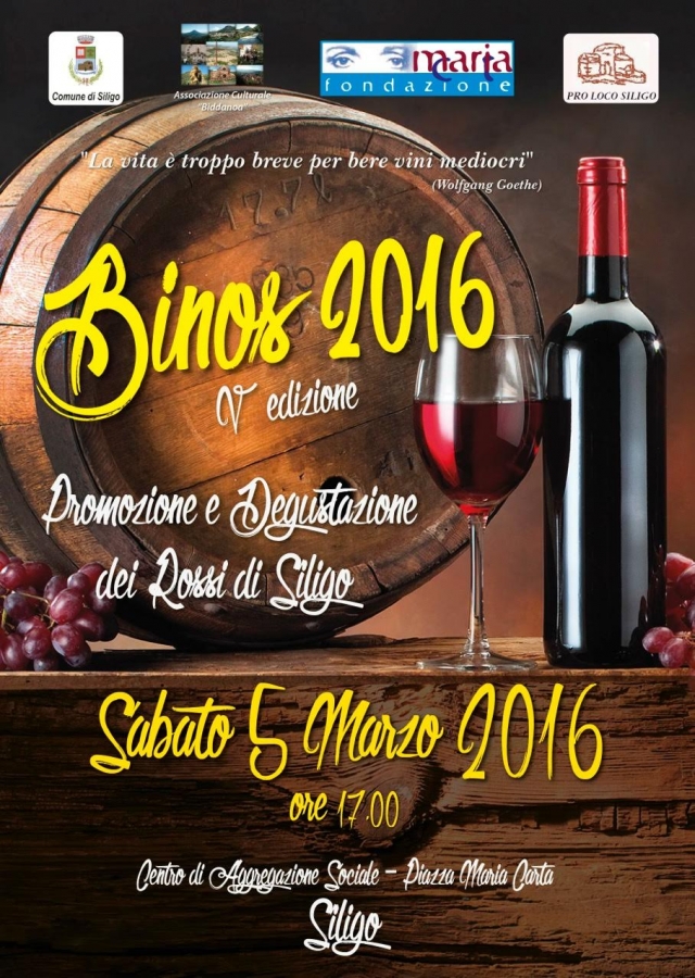 Sono ben 23 i vini in concorso nella Va edizione di “Binos” che si terrà a Siligo sabato 5 marzo, a partire dalle 17, nei locali del centro culturale di Piazza Maria Carta. La rassegna dei rossi locali è promossa dall'associazione Biddanoa con il patrocinio dell'amministrazione comunale, della