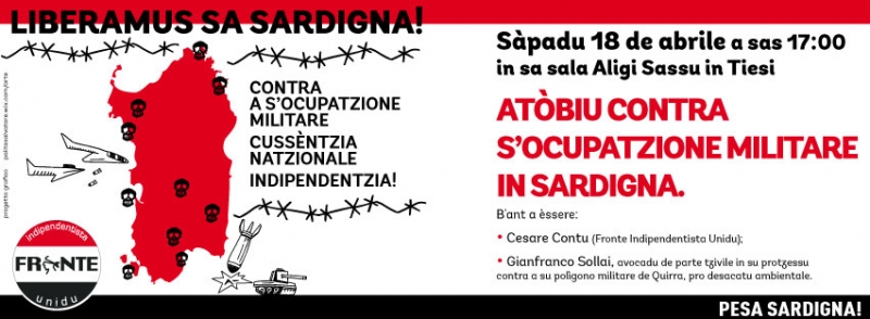 TIESI. Sàpadu su 18 de abrile, a sas 5 de merie in sa sala Aligi Sassu in Tiesi s'at a faeddare de ocupatzione militare in s'aboju ammaniadu dae su grupu tiesinu de su Fronte indipendentista unidu. Pro sos militantes de su Fiu est petzi su primu eventu «intre sos chi amus a organizare in ogni ala de Sardigna». «Amus a fàghere bìdere unu filmadu - gasi sos de su Fiu - in subra de sa chistione e nd'amus a faeddare cun Cesare Contu, unu militante de sos nostros preparadu in subra de s'argumentu, e cun Gianfranco Sollai, membru de su comitadu “Su Jassu”, dae semper interessadu a s'istòria de su polìgonu de Chirra e fina avocadu de parte tzivile in su protzessu».