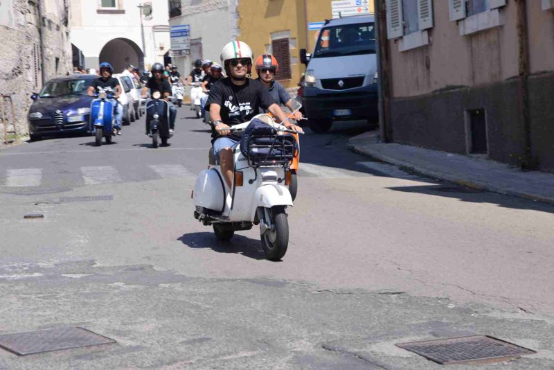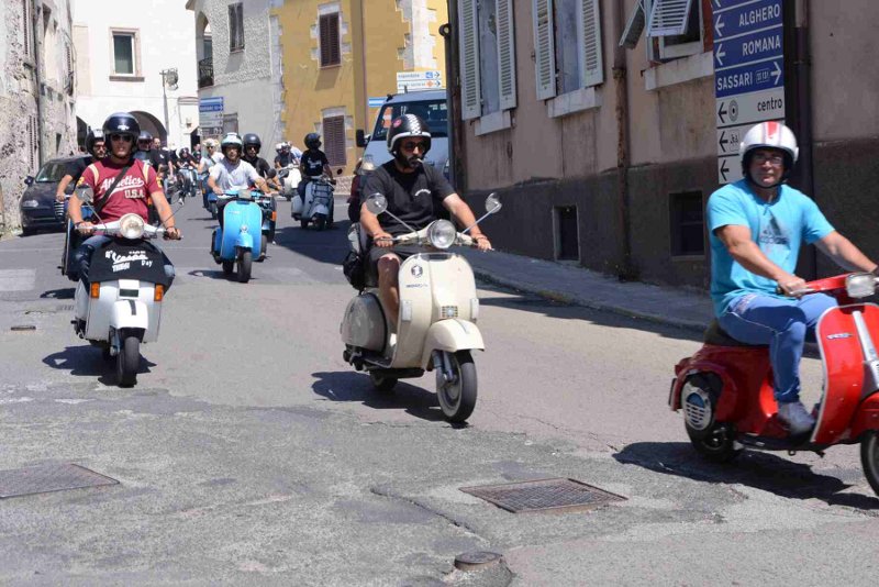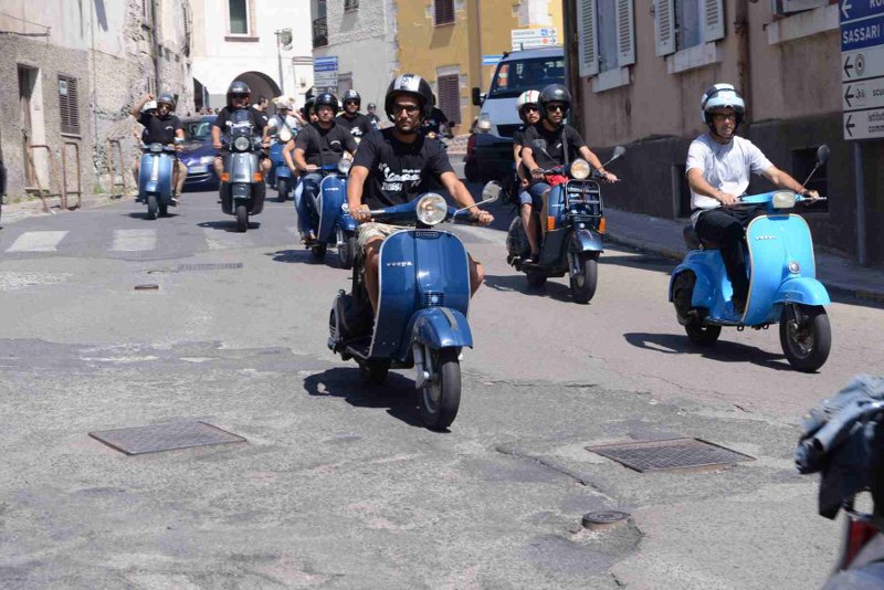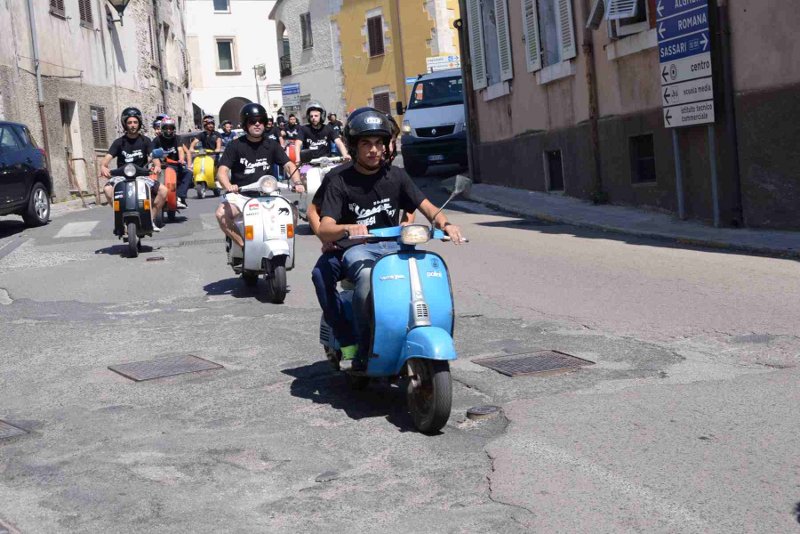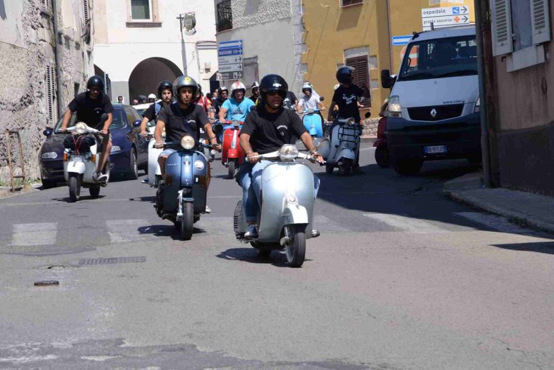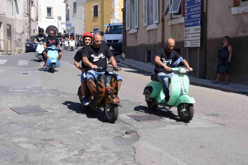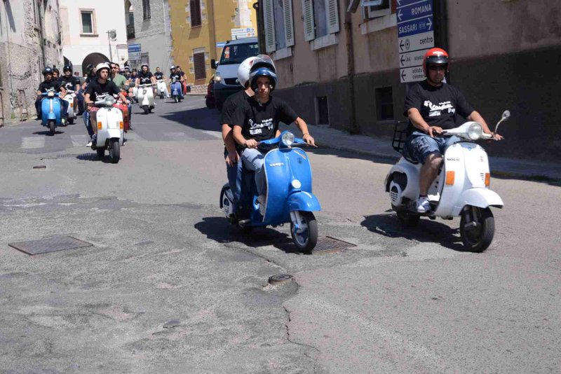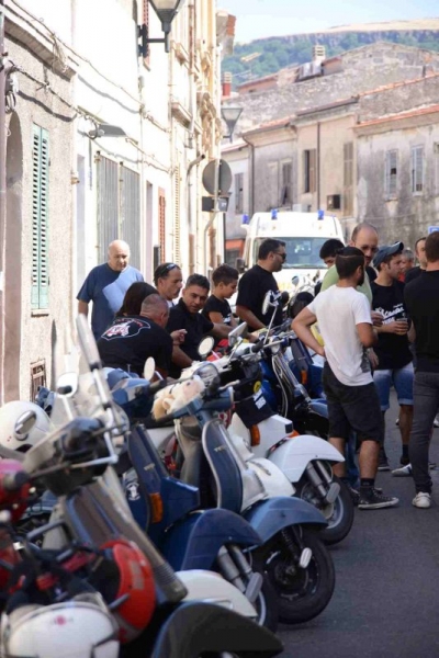 THIESI. A distanza di tre anni si è tenuta domenica 21 luglio la quarta edizione del “Vespa Day” del Meilogu. 120 esemplari hanno invaso l'area del “sottopassaggio” tra il corso Vittorio Emanuele e via Roma: presenti le rinomate 50 special, le 125 primavera (ET3) e quelle a faro basso del 1950, i 150 sprint veloce e anche numerosissimi PK e PX di vari modelli e cilindrata. Dopo la lunghissima coda per l’iscrizione le vespe sono partite in direzione Cheremule. In quella prima sosta un saluto d'obbligo a Mario “Cognacchino” Chessa, il più anziano della compagnia e sempre presente fin dal primo raduno, venuto a mancare lo scorso dicembre. Un mazzo di fiori e un intenso applauso quasi fosse un abbraccio alla moglie e alla sua famiglia. Nella successiva sosta un altro saluto a un altro amico, Antonio Mannu, recentemente scomparso a causa di un incidente stradale: in quel punto sono stati posti dei fiori. Altre tappe, con rinfreschi a Torralba e Bonnanaro (rispettivamente organizzati da Massimiliano Congiunti e dal comitato Santa Barbara) e rientro a Thiesi passando per Borutta. L'incredibile rombare di motori si è concluso nei pressi dell’asilo San Michele dove, nella splendida cornice del giardino dello stesso, è stato organizzato il pranzo x tutti i partecipanti. Hanno partecipato all’eventoi “Vespalguer” di Alghero, i “50 Special” di Portotorres, i “Vespa...Io” di Nuoro, gli “Squadriglia runners” di Sassari oltre ai gruppi di amici di Ossi, Tissi, Usini, Olmedo,Thiesi e paesi limitrofi.